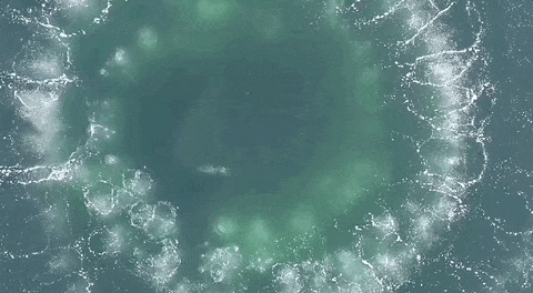 当座头鲸发现鱼群或虾群时,它们会悄悄来到猎物下方,一边转圈一边喷出绵密的气泡。气泡在上升过程中会形成一道“围墙”,将猎物圈在里面。接着座头鲸只需要张开大嘴,向上穿过“围墙”内部,食物便进入到口中。