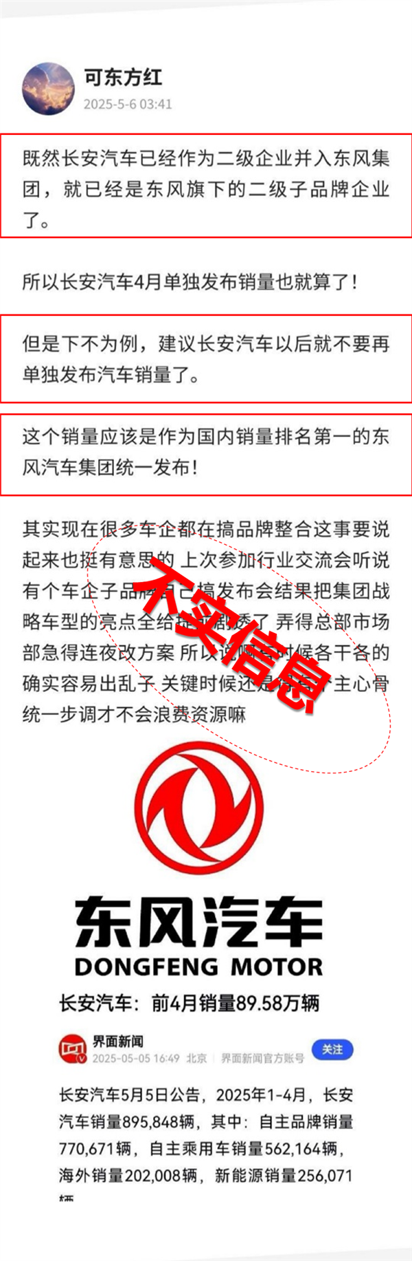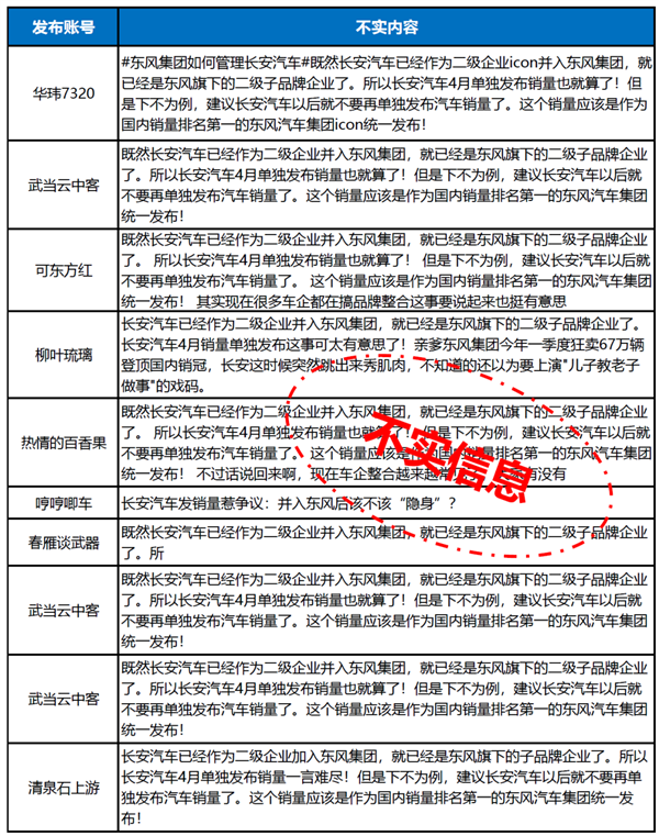 从内容看,相关谣言均指向了“长安汽车作为二级企业并入东风集团”,并劝谏长安汽车不要再单独发布汽车销量,此外还有一些听起来煞有介事的“内幕、隐情”。