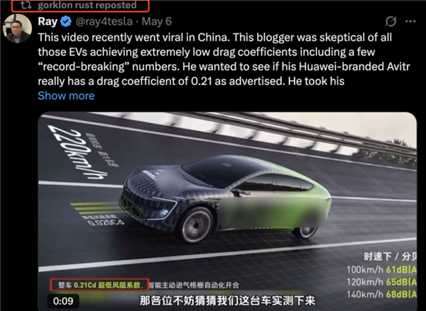 而且在马斯克转发的推文中,还暗暗质疑了中国其它几款新能源产品的风阻成绩。