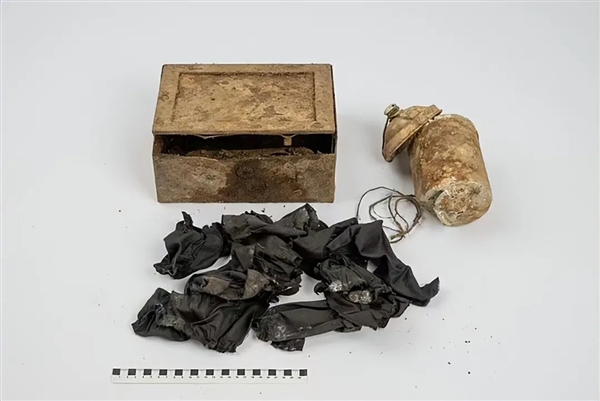 在距离铝罐1米左右的地方,他们又发现了一个铁皮盒子,里面也是“一堆金器”,包括16个烟盒、10个手镯、1个精心编织的银钱包、1把梳子、1条链子和1个粉盒。