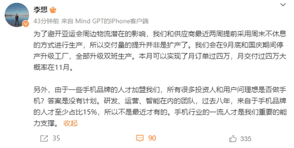 同时,李想透露公司研发、运营、智能在内的团队,过去八年,来自于手机品牌的人才至少占比15%。“所以不是最近才有的,手机行业的一流人才是我们重要的能力支撑。”李想说。
