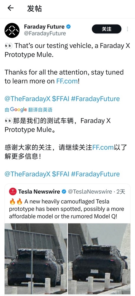 不过,令网友没想到的是,法拉第未来(FF)在X上认领了该车,其官方账号表示,图片中的车辆是其新品牌FX的原型测试车,并且感谢大家的关注。