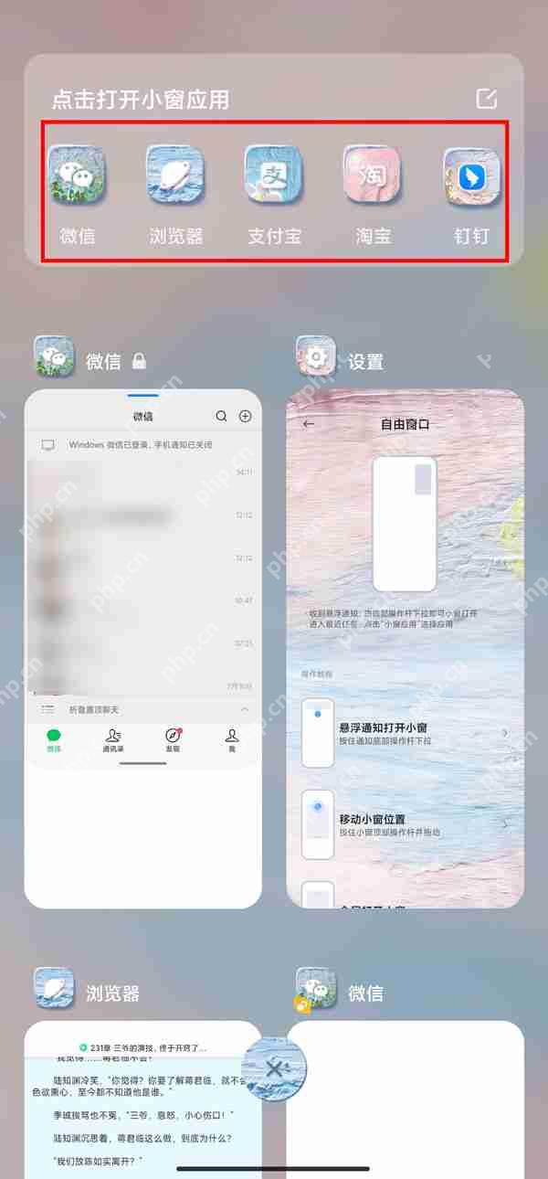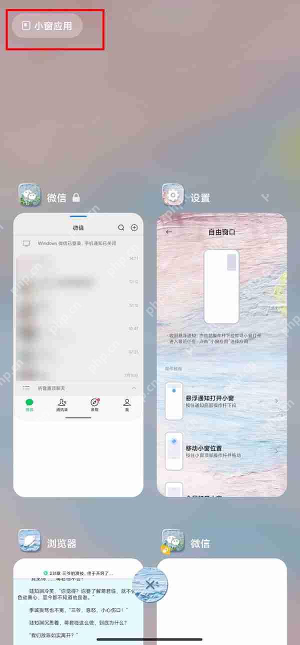 - 从手机屏幕底部向上滑动并暂停,进入多任务界面,点击小窗应用选项。