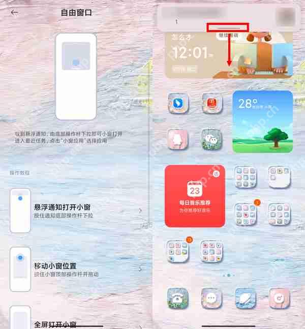 此外,当你收到悬浮通知时,可以点击通知底部的操作杆,向下拉动来打开小窗应用。