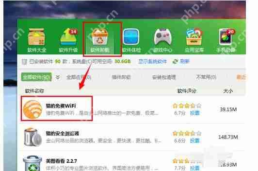 启动软件管家,导航至“软件卸载”界面,找到“猎豹免费wifi”并点击其右侧的“卸载”按钮,如图所示。