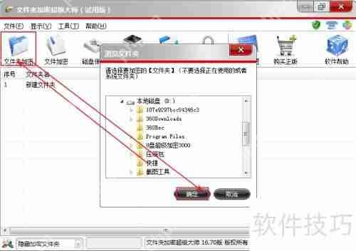 1、 启动文件夹加密超级大师,点击“文件夹加密”按钮,在弹出的窗口中选择需要加密的文件夹。