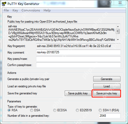 在对话框中点击“save private key”,将私钥保存为key.ppk,并存储在D:根目录下。