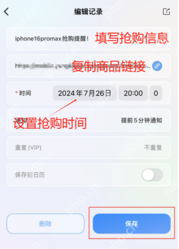 填写标题(例如“iPhone16promax提醒”),从平台复制商品链接,设置具体时间,选择提前5分钟通知,点击保存。