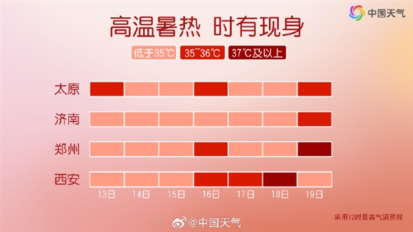 这周五到下周一,北方要扎堆出高温。郑州和西安的最高气温还会超过37℃。