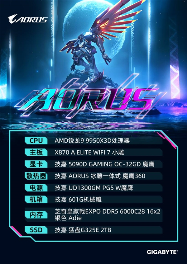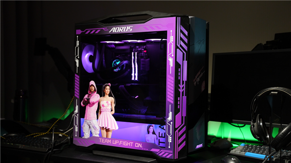 主机外观由技嘉团队与主播共同设计,采用技嘉601G机械雕双面全景玻璃“海景房”机箱和AORUS冰雕一体式魔鹰360水冷,内部配备9个12cm风扇位与全覆盖散热装甲,确保长时间高负载运行时温度稳定。