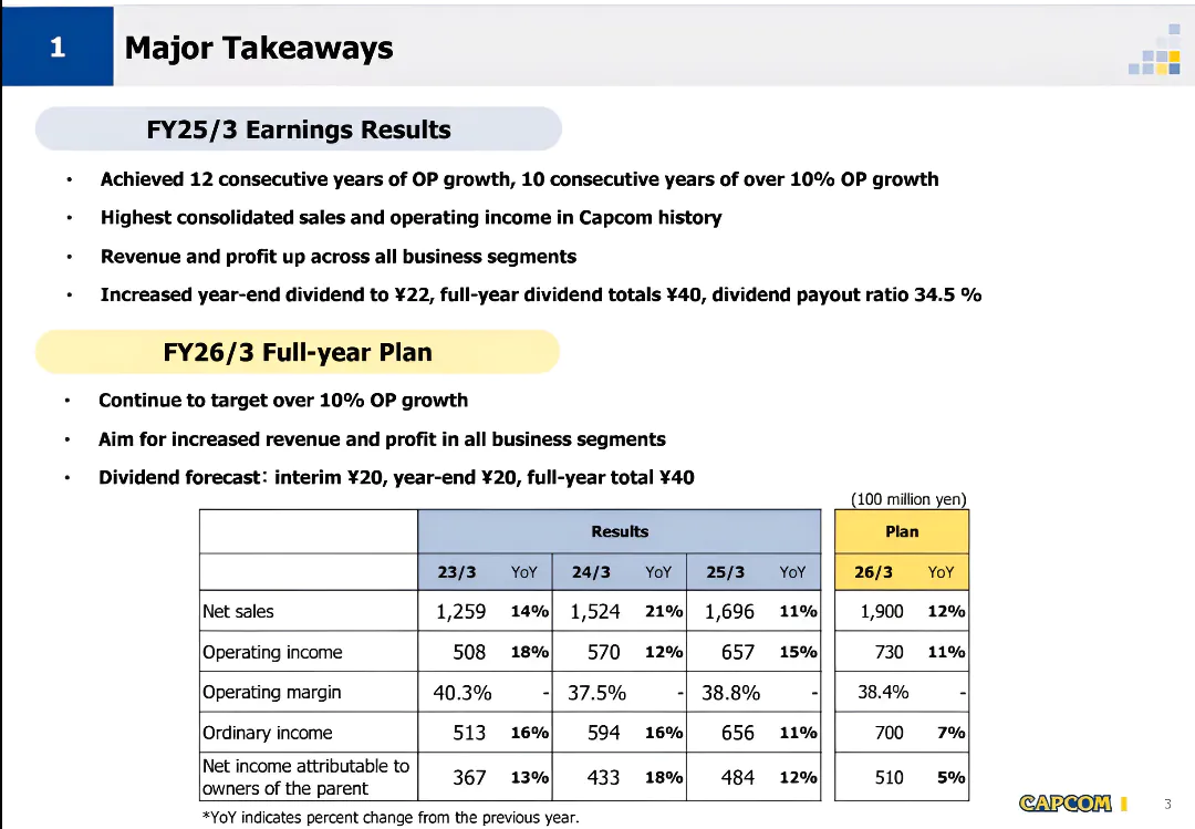 Capcom发布了公司2025财年财报,部分财报数据如下: