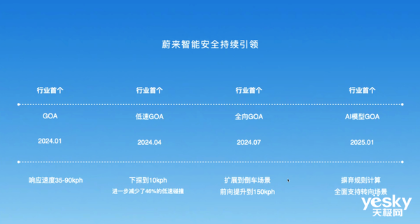 蔚来在Banyan3.0系统时推出基于端到端架构的防碰撞系统,支持GOA通用障碍物预警、MAI误加速抑制、后向AEB覆盖4-15km/h、前向AEB增强自动紧急制动支持最高150km/h、AES自动紧急转向覆盖60-150km/h等等。