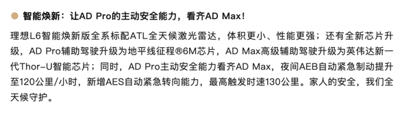 今年,理想L6、L7、L8、L9等全系列迭代新车,Pro入门版本最核心的升级就是全系标配激光雷达,虽然仍不能支持城区辅助驾驶,但却可以带来和Max版本相同的AES自动紧急避让,主动安全能力更上一层楼;