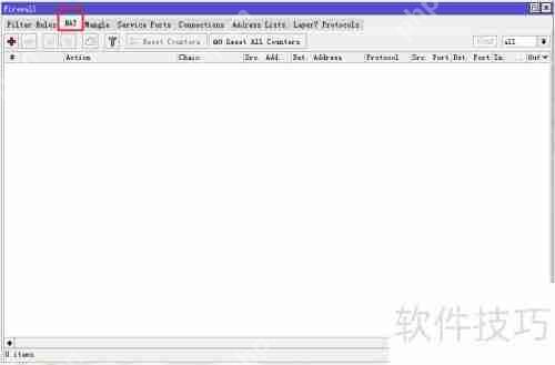 1、 首先,通过winbox登录ros路由系统。登录后,在图形操作面板中找到并点击IP选项。接着,在弹出的菜单中选择firewall(防火墙),进入防火墙设置。然后,在防火墙界面中点击NAT,即可开始配置NAT相关设置,如下图所示。