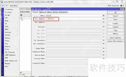 3、 为某个内网IP或网段设置NAT。在上一步配置完成后,点击加号进行新增,如下图所示:假设需要对192.168.0.18,或者192.168.0.19至192.168.0.250这个范围内的IP进行NAT,在面板的src.address处填入192.168.0.19-192.168.0.250,从而对该网段实施地址伪装。如此一来,不在这个网段内的设备将无法访问互联网。单独一个IP地址的伪装也是按照同样的方式进行设置。