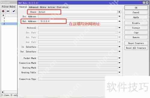 4、 目标地址的伪装或转换。在面板的链(chain)中选择 dst-nat,接着在 dst.address 中填入外网卡地址,下方设置 protocol(协议)和 dst.port(端口)。然后,在 action 里选择 dst-nat,并在 to addresses 填写内网 IP 地址,to ports(内网端口)按需设定,参照示例图完成配置。以上就是本次学习内容,感谢大家的关注!