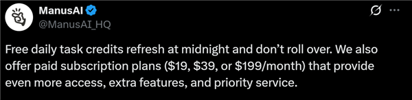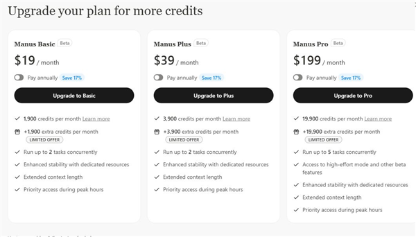 针对不同用户和不同需求,Manus提供三种付费订阅计划,定价分别为每月19美元、39美元或199美元,以提供更多访问权限、额外功能和优先服务。