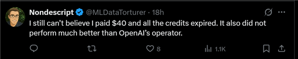 也有博主吐槽“我还是不敢相信我付了40美元,结果所有的积分都过期了。而且它的表现也没比OpenAI的产品好多少。”
