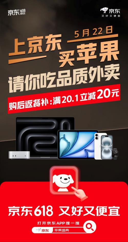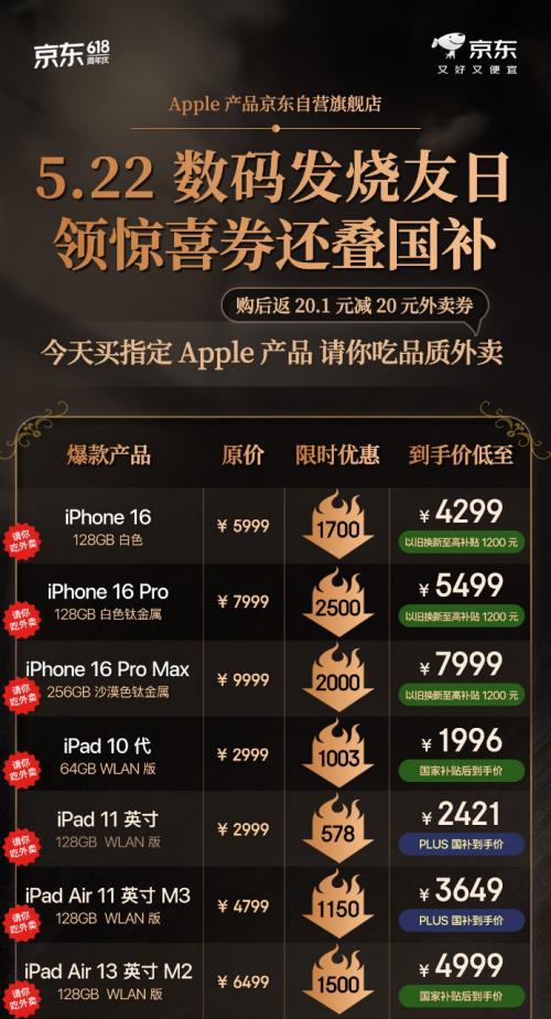 京东请你吃品质外卖!5月22日上京东买苹果,下单Apple产品还返餐补,获得满20.1元减20元的大额外卖券。另外,为让广大消费者可以低价入手Apple产品,Apple产品京东自营旗舰店还带来了iPhone 16 Pro系列至高优惠2500元、惊喜券叠加国家补贴、限时抢以旧换新1200元大额券等福利,部分产品还能额外叠加PLUS大额消费券、教育优惠,全线产品国补后低至6折还能享12期免息,只需打开京东APP搜索“苹果盛典”即可开启选购,心动的果粉不要错过这次难得的机会。