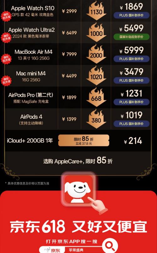 手表方面,Apple Watch S10 GPS 42毫米限时直降650元,领国家补贴立省15%,PLUS会员还有专享150元优惠,可节省1130元,到手价1869元;Apple Watch Ultra 2可享限时直降500元+国家补贴500元共计1000元的优惠,到手价5499元。Mac方面,MacBook Air M4 13英寸 16G 256G京东PLUS会员领国家补贴立省20%,叠加限时直降和PLUS专属优惠后共减2000元,到手价5999元;Mac mini M4 16G 256G京东PLUS可优惠1020元,到手价3479元。用户购买以上指定款型iPhone、iPad、Apple Watch、Mac产品后均可返满20.1元减20元的外卖券,升级装备的同时还能享餐补优惠,果粉们不要错过这波难得的福利。此外还有AirPods Pro(第二代)京东PLUS会员享到手价1231元,AirPods 4京东PLUS会员享到手价1019元,iCloud+ 200GB 1年限时85折,到手价214元,用户选购AppleCare+服务时也可享限时85折。