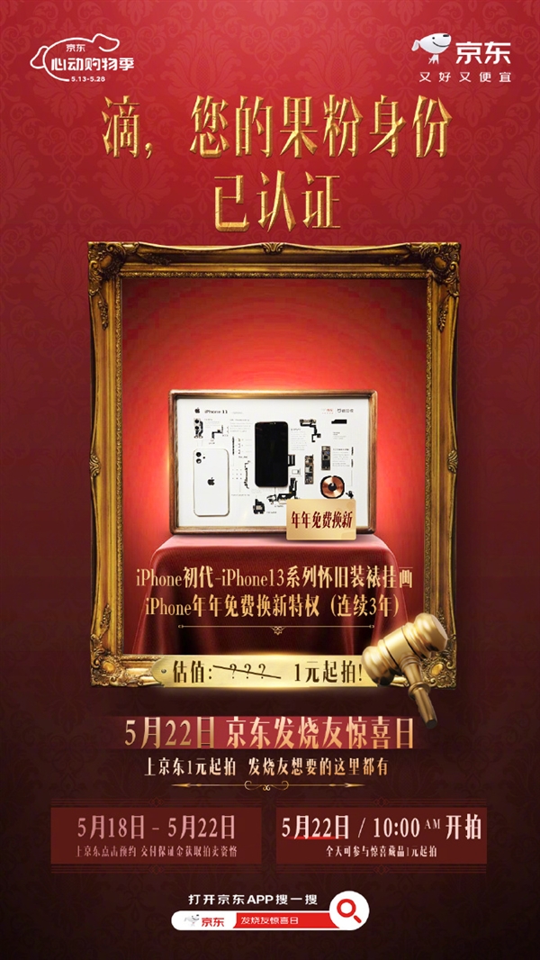 更牛的是,这全球只有一份的艺术品在京东1元起拍!打开京东APP搜一搜,发烧友惊喜日或搜索“苹果盛典”即可参与竞拍,挑选适合自己的心仪好物,5月22日公布结果。