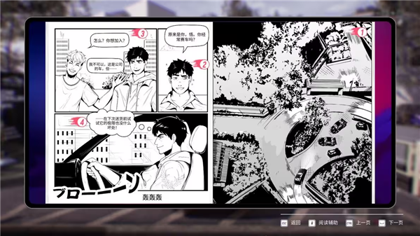 玩家生涯以漫画叙事的主线故事展开,是该作的一大亮点。进入游戏,充满画面张力的漫画便呈现在玩家的视线中,黑白线条勾绘出的日式艺术内核,使得每位角色具有独特立体的人格魅力。写实画面的汽车工业机械艺术,让玩家再次感受到曾经掀起热潮的漫画《头文字D》,也许正是制作组的目标。在该作中,玩家所扮演的青年将进入“群玉县”,挑战当地的漂移车手。在该过程中,除了能够不断磨练驾驶漂移的技术以外,还能通过这段漂移旅程,感受浓厚的日式赛车文化,一步步成长为顶级车手。