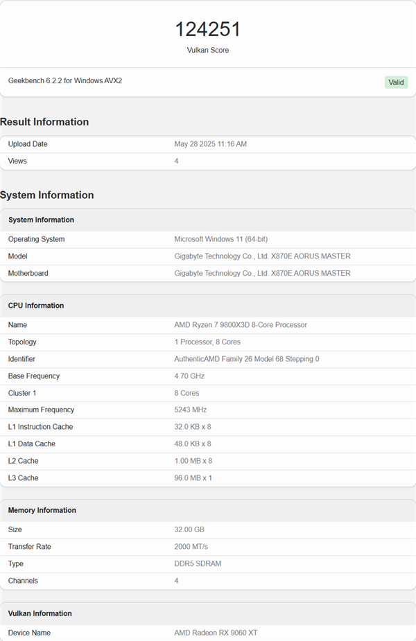 值得注意的是,Geekbench的测试结果并不完全反映显卡在实际游戏中的表现,尤其是在DirectX、光线追踪和图像缩放技术的支持方面,因此还需要更完整的评测,才能对RX 9060 XT的实际性能做出更准确的判断。