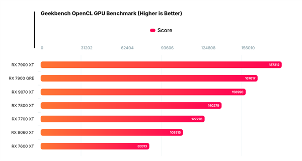 在Geekbench的OpenCL测试中,RX 9060 XT 16GB的得分为109315分,比上一代的RX 7600 XT 16GB快31%,但比RX 7700 XT慢14%。