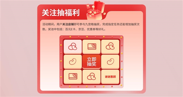 此外,在活动期间,用户仅需关注店铺,就可参与九宫格抽奖,有机会获得百元E卡、京豆、优惠券等好礼。想要增加抽奖次数的用户可以通过完成指定任务获取。机会难得,快来试试你的手气吧,说不定幸运的就是你!