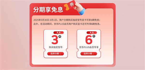 特别提醒:在2025年5月30日20:00-6月1日23:59期间,用户分期购买指定型号显卡可享3期免息!此外,在整个618活动期间,京东PLUS会员用户购买显卡还可专享6期免息!这绝对是升级装备的绝佳时机,让高性能显卡不再遥不可及。