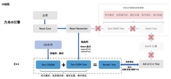 另一方面,在 C++ 侧 Taro 会指令式地调用 ArkUI 在 C++ 侧提供的 API,来高效地创建节点、设置属性、绑定事件以及绘制上屏。