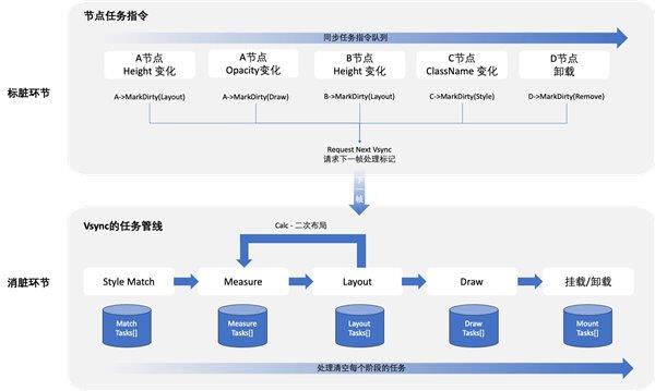 同时,Taro还基于鸿蒙提供的VSync机制设置一套任务处理管线,来处理中间层和下层节点树产生的样式匹配、节点测量、节点布局、样式设置以及节点上屏等任务,来保证任务的时序性和最后上屏渲染结果的正确性。