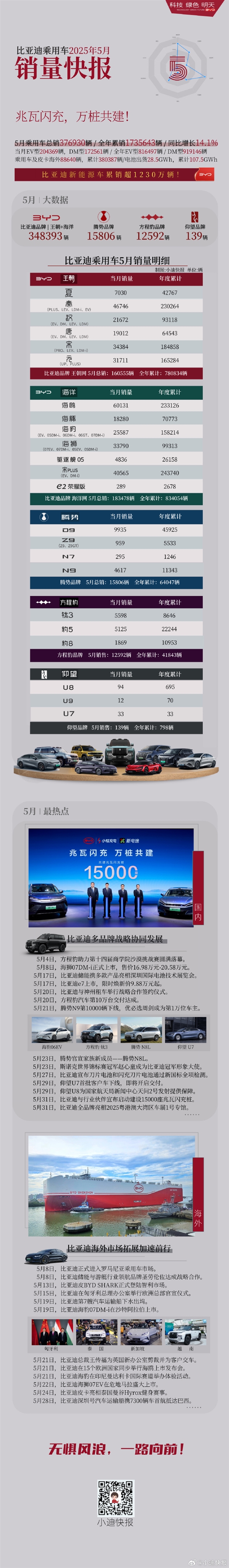 电脑知识网6月1日消息,比亚迪今天公布了乘用车2025年5月销量明细。