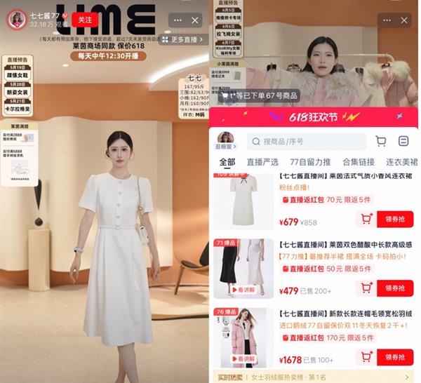 最近,高端女装品牌LIME莱茵及其旗下的女装品牌LIME FLARE分别做了一场618直播,通过“七七酱77”直播间,两场直播销售近600万元。