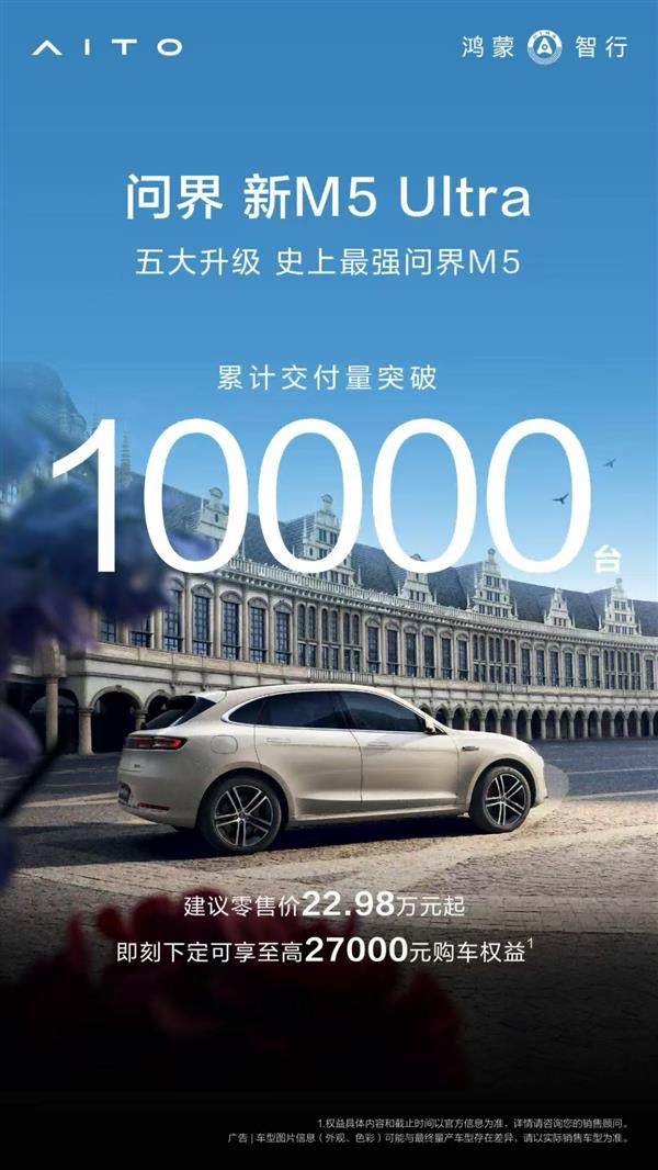 市场是最好的试金石,问界M5系列凭借过硬产品力,已成为15万用户的品质之选,口碑与销量齐飞。问界新M5 Ultra从3月20日上市至今交付已破万,4月份的NPS(净推荐值)超过90%,备受广大用户认可和喜爱。更难得的是,这款车以22.98万元起的起售价,配合限时至高27000元购车权益(含20000元ADS高阶功能包、6000元选配金、1000元交付礼包),在品价比和智价比两个维度都树立了同级新标杆。