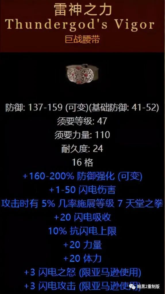 体力:关系到人物的血上限、耐力上限(跑步用的那个,后期基本上不用管,都是够的)。精力:关系到人物的魔法值上限。这个着重强调,暗黑2里面除了一些极个别的玩法,几乎全部玩法不用自己用属性点加任何精力。这源自暗黑2的装备系统设定,大多数装备加法力上限很多(比如一个戒指就能加到70多的魔法上限),并且魔法耗费没有特别巨大的;此外,还由于法系职业回法速度很快,加上眼光符文之语的光环,就基本不用愁法力,战系职业只要穿上偷取法力的装备,攻击的同时回法很快。综合上述种种原因,完全不需要加精力来提高魔法上限。有相当大一部分装备,因为其具有撑高属性点的优势,成为不少玩法的首选装备,比如下图雷神腰带,近战德鲁伊可以穿它,纯粹就是为了20体力和20力量。