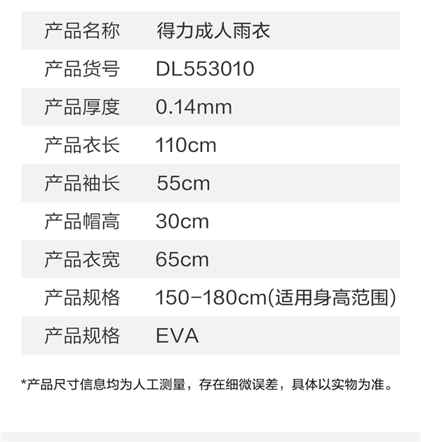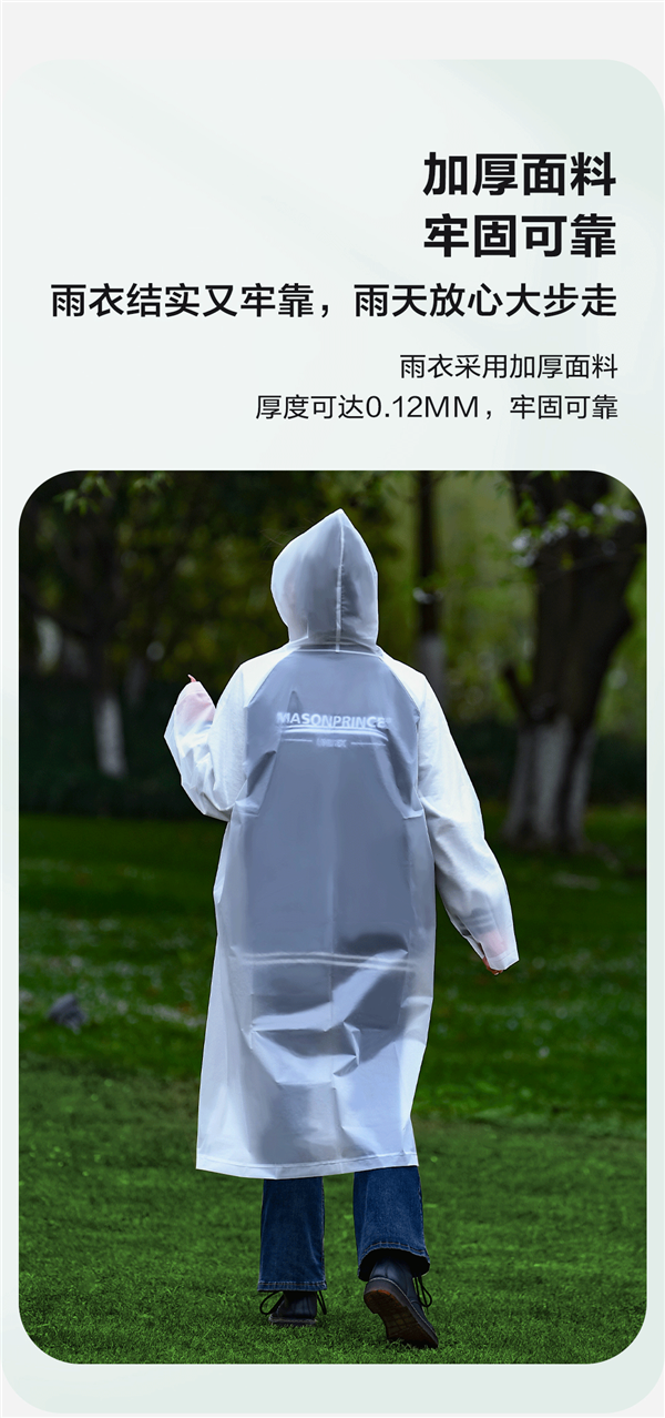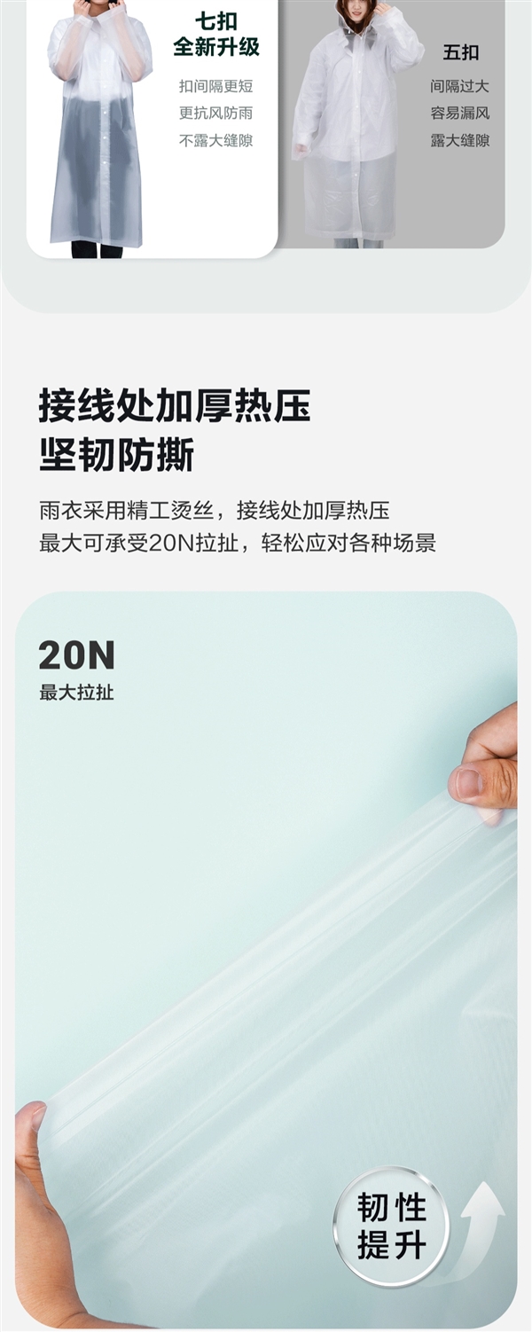 雨衣采用精工烫丝,接线处加厚热压,最大可承受 20N 拉扯,刮风下雨也不怕。