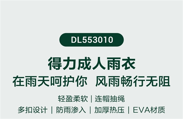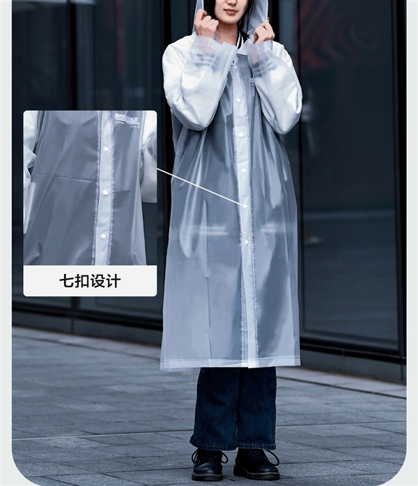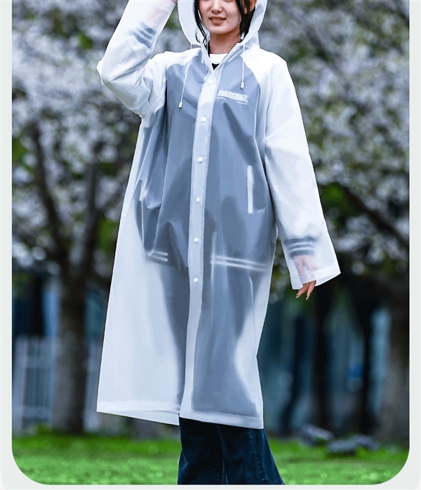 EVA 材质 + 连帽抽绳 + 多扣设计 + 防雨渗入 + 轻盈柔软。