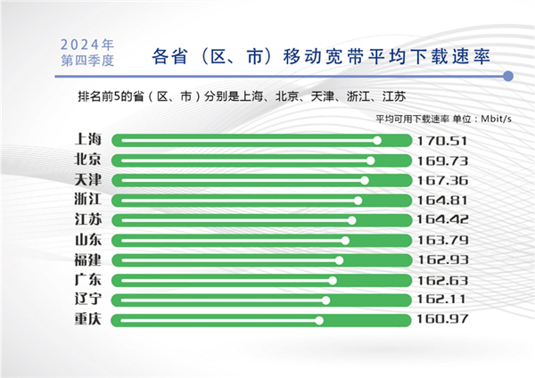 移动宽带下载速率方面,上海、北京、天津、浙江、江苏的移动宽带网络用户下载速率排在全国省级行政区前五位。