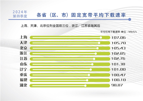 速率方面,在2024年第四季度,我国固定宽带网络平均下载速率(用户体验)达到99.14Mbit/s,环比上季度提升了3.51%,同比提升了15.26Mbit/s,年度提升幅度达到18.2%。