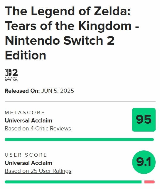 《塞尔达传说:王国之泪》NS2版的M站媒体均分现已出炉,目前仅收录四家媒体,均给出好评,均分95分,玩家评分9.1分。