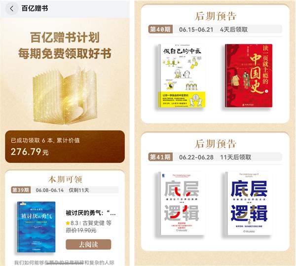 华为阅读还为读者提供了丰富的线上线下活动,“百亿赠书计划”每周都有精品好书免费赠送给读者,《底层逻辑》《被讨厌的勇气》这些热门书籍尽在其中,给读者带来对外部世界更多的认知和实现自我的和解。“百城花粉读书会”则持续在全国开展,近期还将走进武汉、成都、青岛、大理等全国城市,为读者带来一个读书+社交的平台,遇见更多品味相似的书友。
