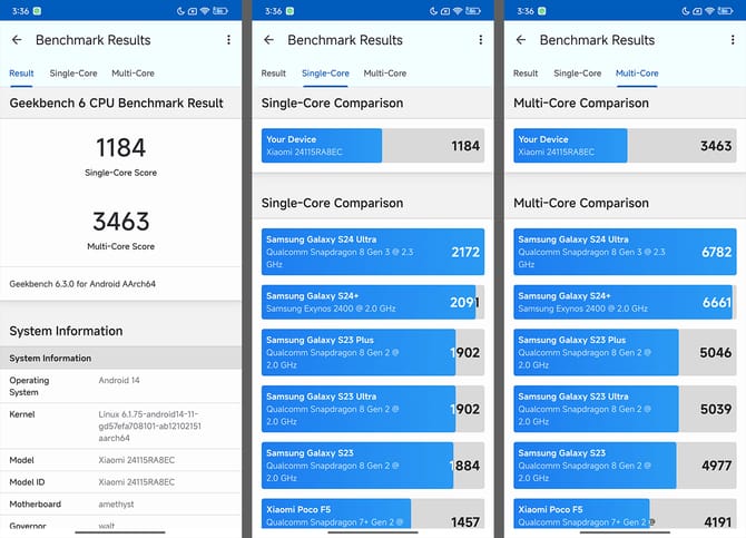 GeekBench 6的跑分上,单核心1184,多核心3463,基本和手机定位下的跑分保持一致,性能足够绝大部分的场景使用。