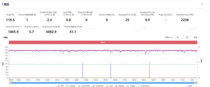 具体表现在实测中进行,在室温约27-28℃的测试环境中。首先是120帧+极 致画质的《王者荣耀》,打开抗锯齿以及画质优先。在负载更高的10V10中,OPPO Find X8 Pro的平均帧数为119.6帧,整体的帧数曲线很平稳,接近一条直线,面技能释放众多的大规模团战,偶尔会出现轻微的几帧波动,但游戏画面无感知。期间整机功耗约为4.8W,机身至高高温度为38.8℃。