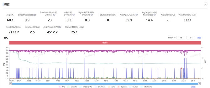 接着打开性能要求更高《原神》,设置为60帧+极高画质,在纳塔跑图打怪30分钟。OPPO Find X8 Pro整体的帧率表现依旧亮眼,全程几乎跑满。除了在27分钟左右因网络波动出现了小部分掉帧情况,其他时间段帧率曲线表现得很平直。这种画面丝滑帧数稳定的表现,OPPO Find X8 Pro功耗只需4.5W,机身至高温度约39.9℃。