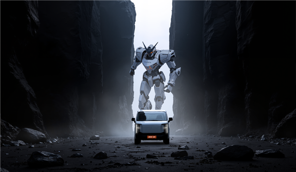 两侧大灯组中间是与车身同色的封闭式面板,前杠使用了黑色的涂装,上侧带有进气格栅,营造出了一种科技机甲风,这也和广告片中出现的“高达机器人”呼应,大概率是在暗示整车走的是“科技机甲”风格。