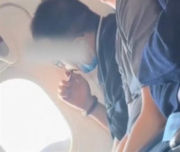 根据视频,在飞机机舱内,有位乘客多次摘下口罩吸食电子烟。