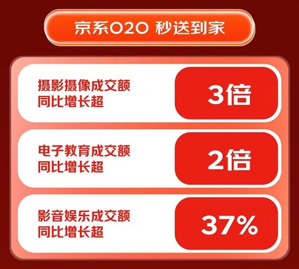 服务层面同样值得关注。伴随消费者对即时配送服务的需求增长,京东秒送依托京系O2O能力高效响应,推动3C数码核心品类销售爆发。通过实现快至分钟级的商品交付,该服务精准满足用户急购需求,成功助推摄影摄像品类成交额同比增长超3倍,电子教育品类成交额同比增长超2倍,并带动影音娱乐品类达成37%的稳步提升。