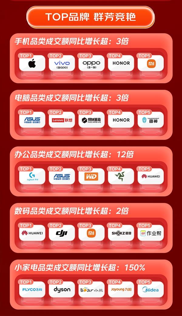 细分品类中,办公设备爆发尤为亮眼,成交额飙涨超12倍,罗技、华硕、西部数据等大牌深受消费者青睐。数码品类成交额同比增长超2倍,华为、大疆、小米、韶音、作业帮稳居品牌头部阵营。小家电消费升级趋势明显,飞科、戴森、小熊、九阳、美的等品牌带动品类成交额同比增长超150%。