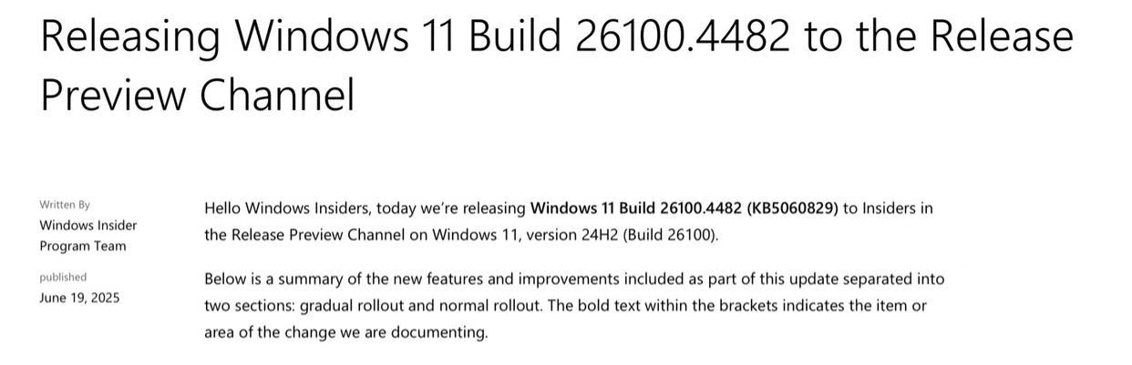 微软现已为 Release Preview 频道的 Windows Insider 项目成员推送适用于 Windows 11 24H2 的 KB5060829 更新,用户安装后版本号升至 Build 26100.4482。